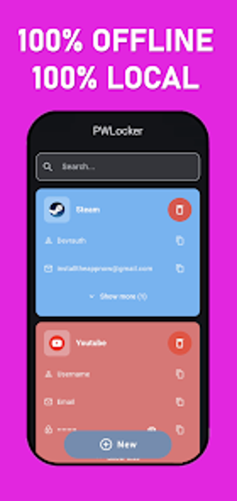 PWLocker هو مدير كلمات مرور قوي مصمم لمستخدمي Android، يوفر حلاً آمناً وغير متصل لإدارة المعلومات الحساسة مثل كلمات المرور، والبريد الإلكتروني، وأسماء المستخدمين، والرموز. مع التركيز على الخصوصية، يقوم PWLocker بتخزين جميع البيانات محلياً على الجهاز، مما يضمن عدم نقل أي معلومات إلى خوادم خارجية أو أطراف ثالثة. وهذا يجعله خياراً مثالياً للمستخدمين الذين يفضلون الأمان والتحكم في بياناتهم.